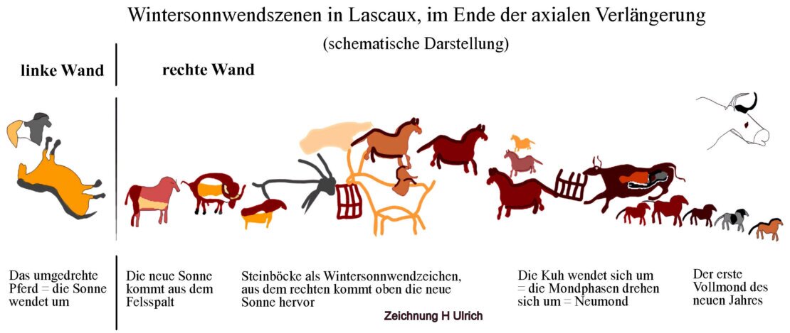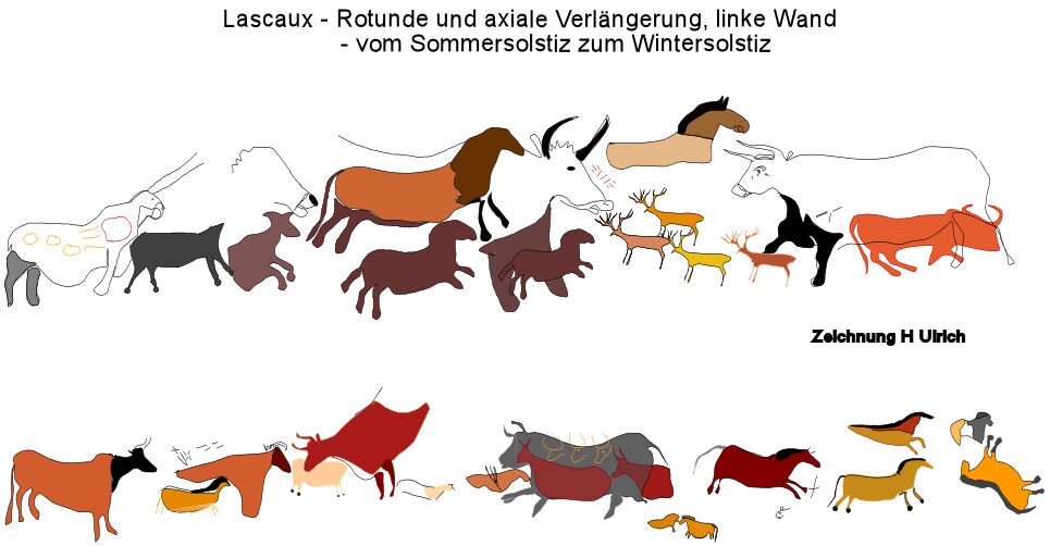The red bison on the right and the black and red cattle in the axial extension each represent a new moon. So four months pass until the winter solstice at the bottom right. This is represented by the twin horses. The second horse is not only turned horizontally, but also vertically. This led to the old name "falling horse".